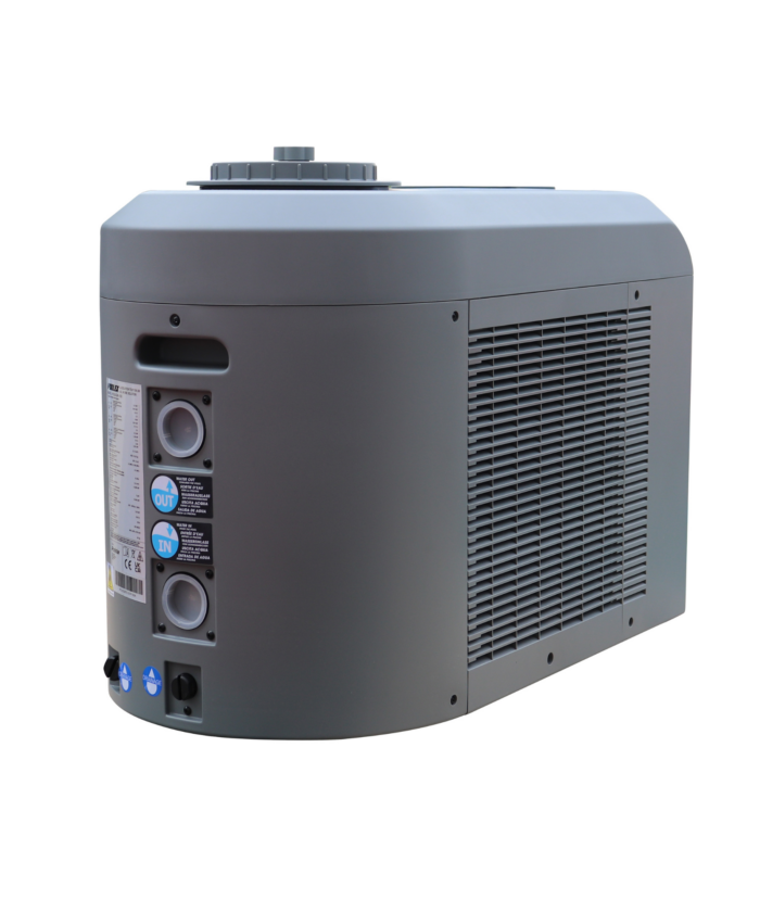 Sistema todo en uno para piscinas de hasta 25 m³ que integra filtración, tratamiento del agua, calefacción y control inteligente en un solo equipo.